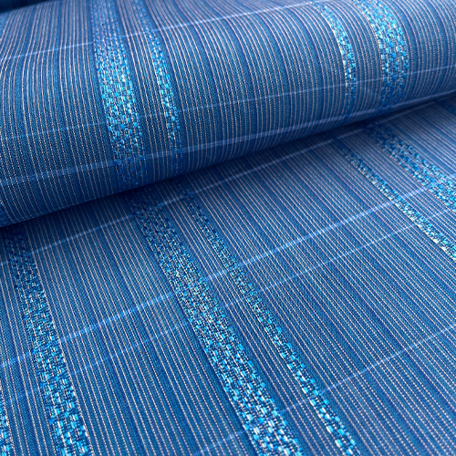 2021年10月 制作/染料:ログウッド 、クチナシブルー、藍生葉、刈安、エンジュ+クチナシブルー 浮織で静かな凪の波紋様を現してます。 ゆらぐ感じがでるかなと、縞の間隔も太くしたり細くしたりしています。