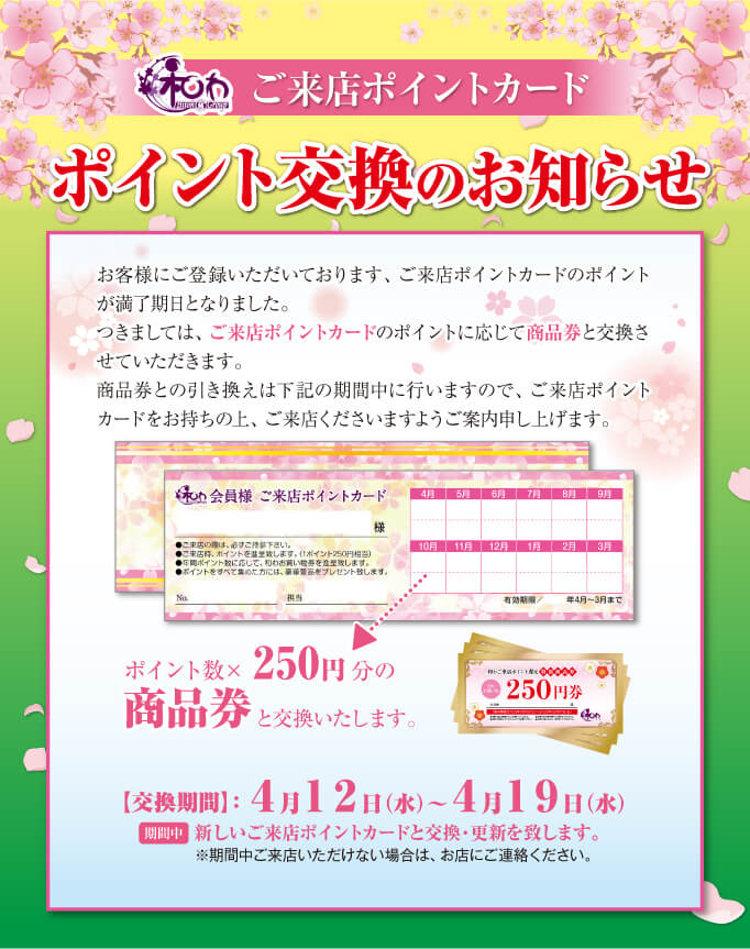 4月12日(水)〜19日(水)の期間中に、ご来店ポイントカードをお持ちの上、ご来店くださいますようご案内申し上げます。