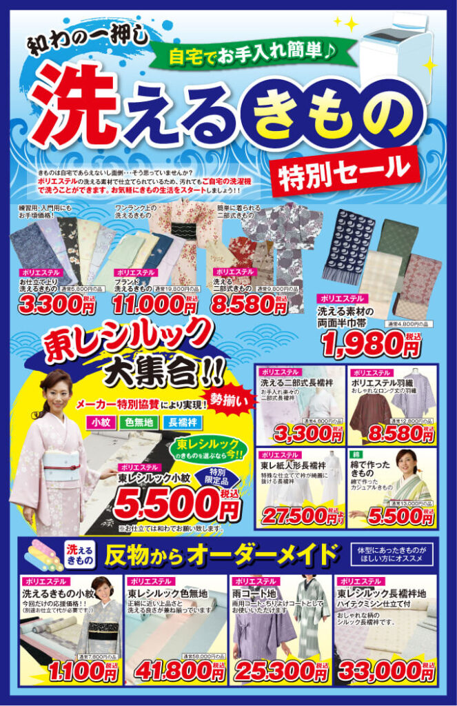 きものは自宅で洗えないし面倒・・・そう思っていませんか?和わ一押しの「洗えるきもの」は、ポリエステルの洗える素材で仕立てられているため、汚れてもご自宅の洗濯機で洗うことができます。お気軽にきもの生活をスタートしましょう!