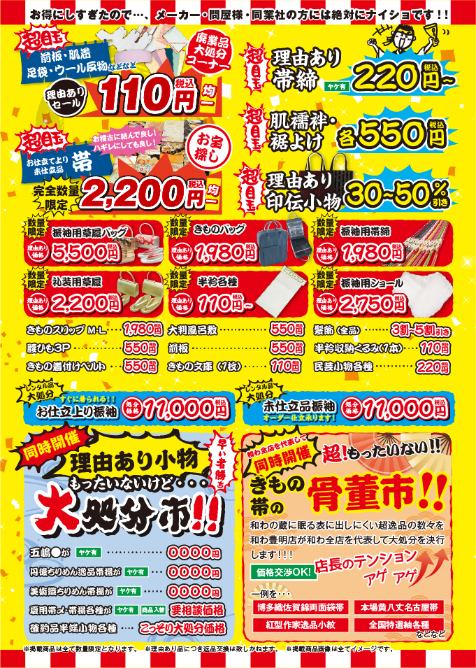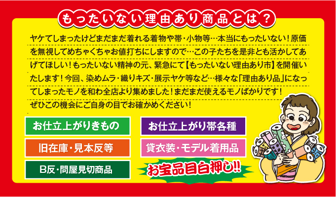 ヤケてしまったけどまだまだ着れる着物や帯・小物等…本当にもったいない!原価を無視してめちゃくちゃお値打ちにしますので…この子たちを是非とも活かしてあげてほしい!もったいない精神の元、緊急にて【もったいない理由あり市】を開催いたします!