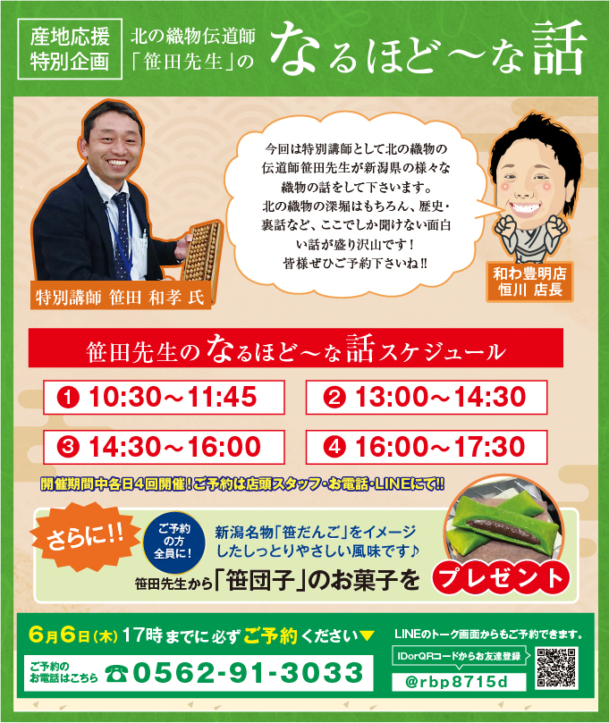 特別講師として北の織物の伝道師笹田先生が新潟県の様々な織物の話をしてくださいます!