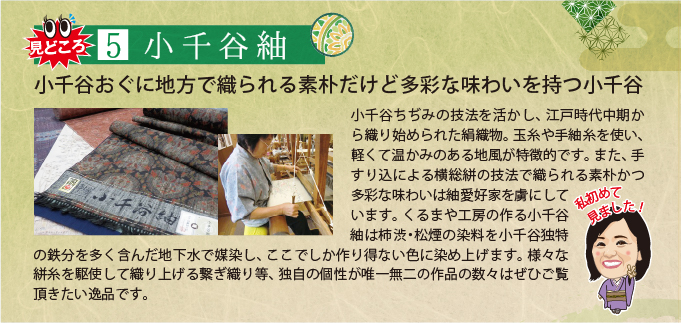 います。くるまや工房の作る小千谷紬は柿渋・松煙の染料を小千谷独特の鉄分を多く含んだ地下水で媒染し、ここでしか作り得ない色に染め上げます。様々な絣糸を駆使して織り上げる繋ぎ織り等、独自の個性が唯一無二の作品の数々はぜひご覧頂きたい逸品です。