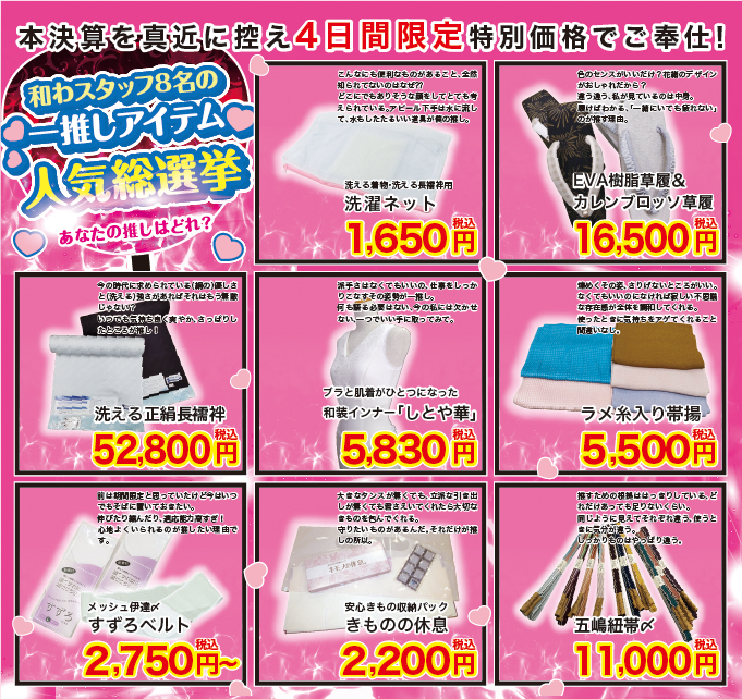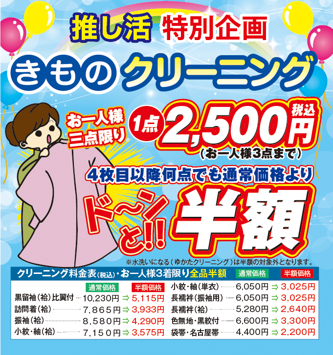 お一人様三点限り!きものクリーニングが一点2,500円(税込)!