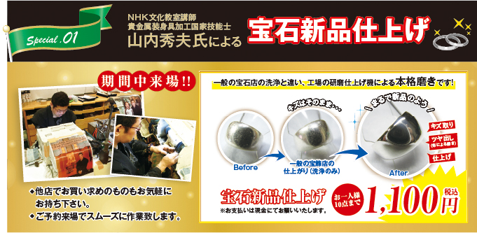 他店でお買い求めのものもOK!一般の宝石店の洗浄と違い、工場の研磨仕上げ機による本格磨きです!