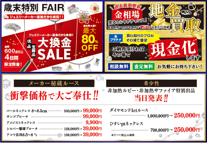 最大80%OFF!ジュエリーの大換金SALEに加え、地金の買取も行います!
