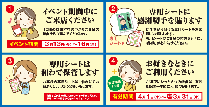 感謝切手5枚を和わにお持ちいただき、専用シートのご希望の特典5箇所に、感謝切手をお貼りください。