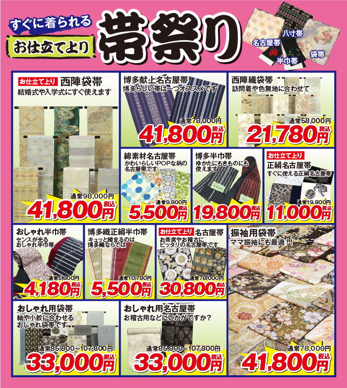 西陣袋帯や博多半巾帯や振袖用袋帯などを取り揃えました!