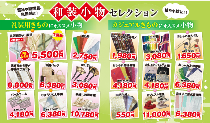 和装小物が春のきもの祭り特別価格に‼この機会に揃えてみてはいかがでしょうか。