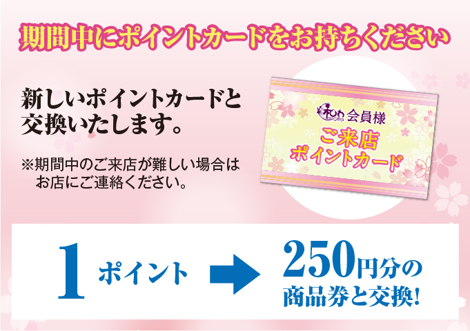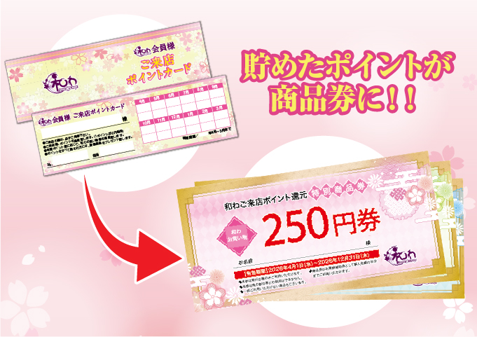 ご来店ポイント1ポイントにつき商品券250円分と交換致します。